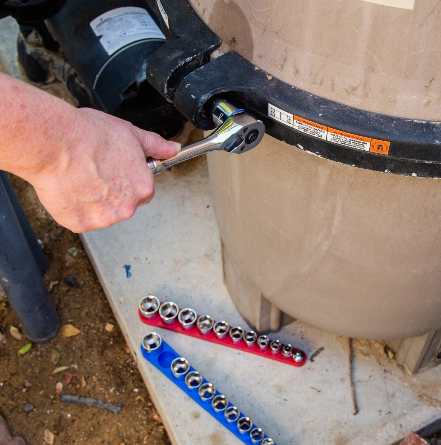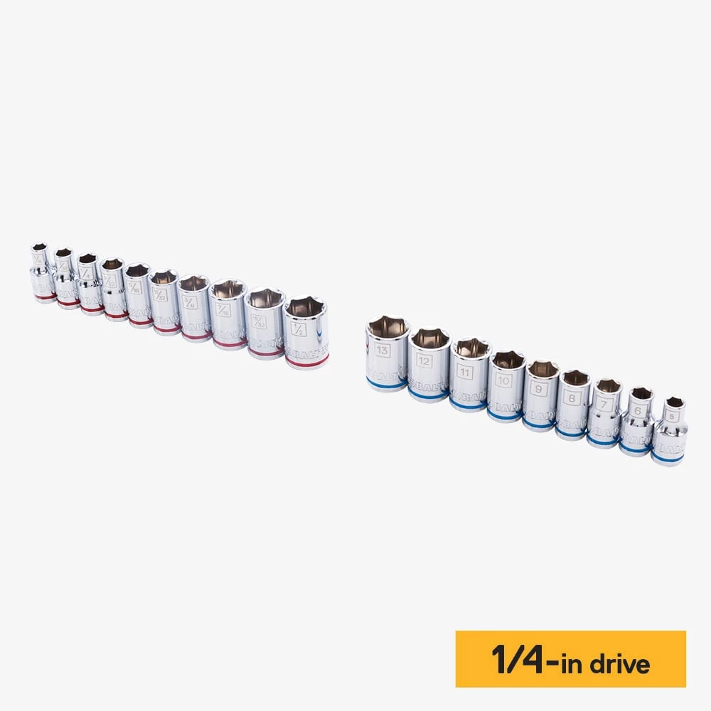 - Metric and SAE socket sizes are easy to identify with laser etched size call-outs and color-coded stripes to identify metric (blue) and SAE (red) measurements
