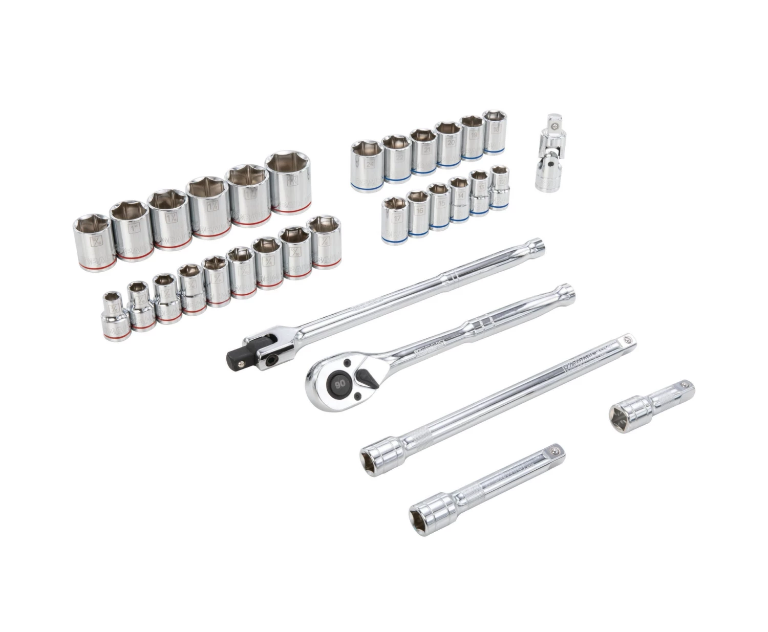 - This set includes 12 metric and 15 SAE 1/2-in drive 6-point sockets, 3 extensions, 1 universal joint adapter, 1 ratchet and 1 flex-head breaker bar