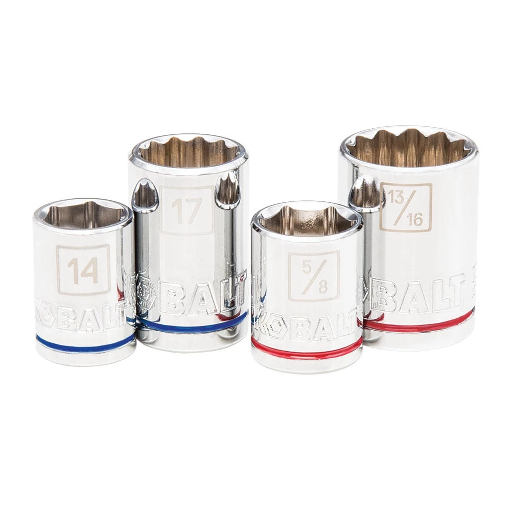 - 1/2-Inch, 12-point drive sockets include 11/16, 3/, 13/16, 7/8, 15/16, 1.0-in and 15, 16, 17, 18, 19 and 24mm