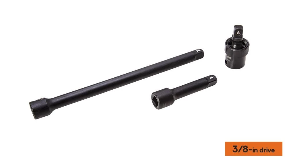 - 3/8-In drive impact accessories include a 3-in extension, 8-in extension and a 3/8-in drive swivel adapter
