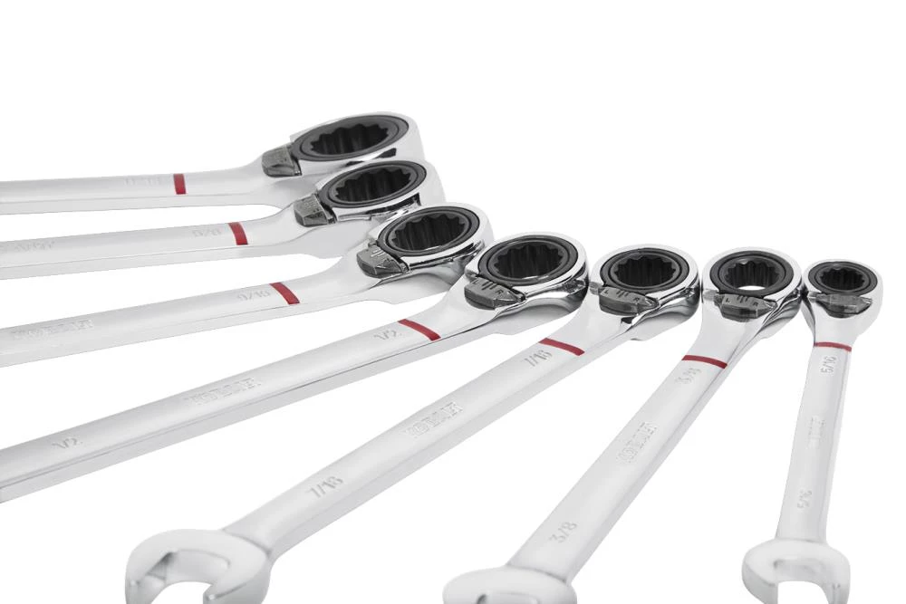 - Set includes 5/16, 3/8, 7/16, 1/2, 9/16, 5/8, and 11/16-inch reversible ratcheting wrenches