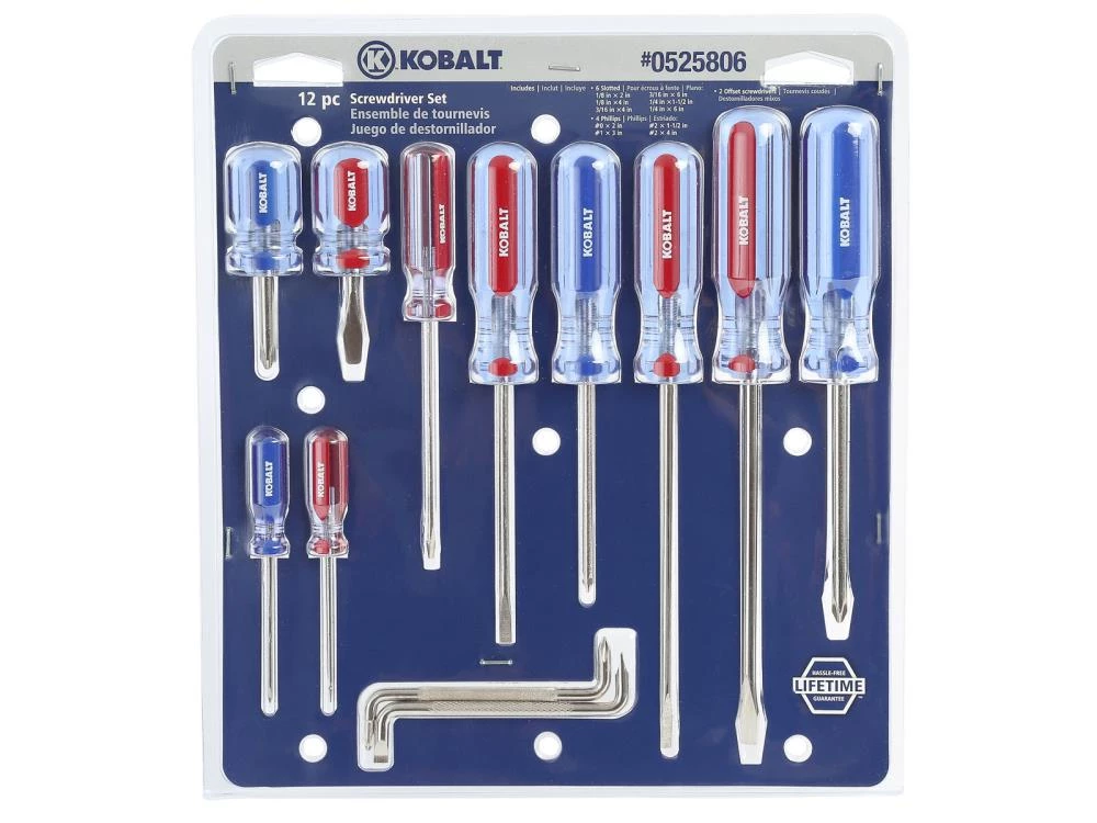 The Kobalt® 12 piece screwdriver set features CR-V steel shafts for strength and durability and a precision ground sandblasted tip for accurate fit. This screwdriver set comes with the highest quality acetate handles for long lasting use and extra gripping power. Traditional quality and dependability.
