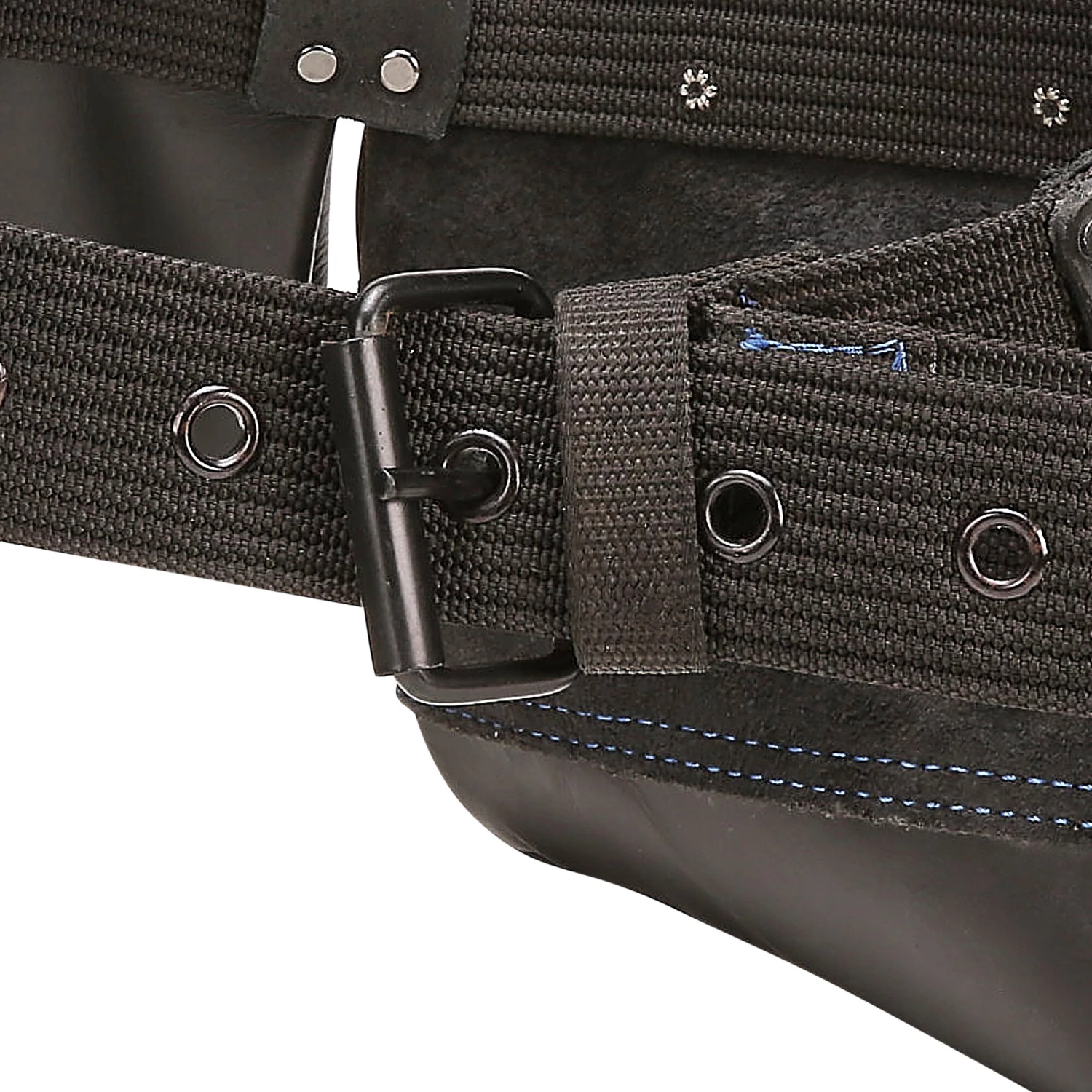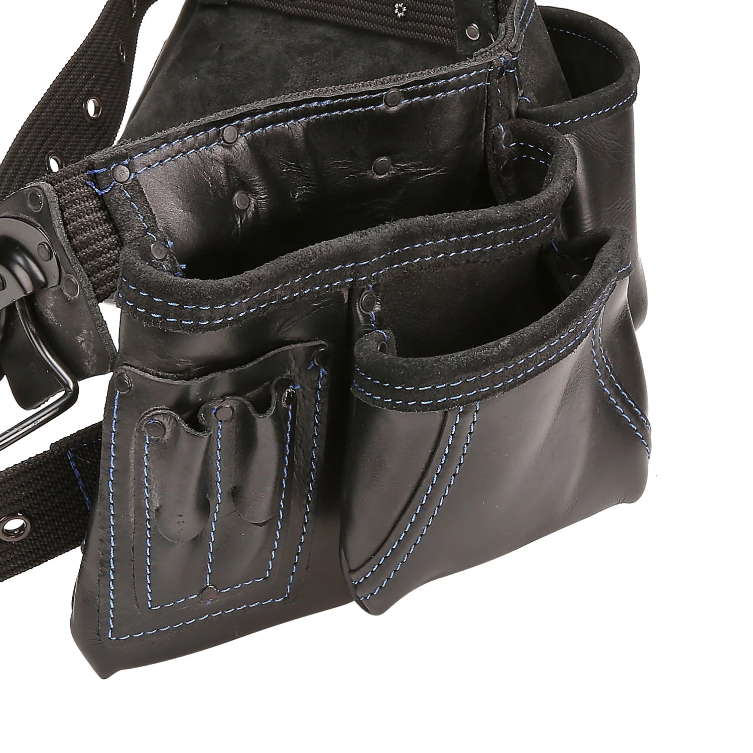 Kobalt’s carpenter’s leather apron has a 2″ wide web belt with a roller buckle and multiple pockets and sleeves, includes a swinging “snap-in” hammer holder.
